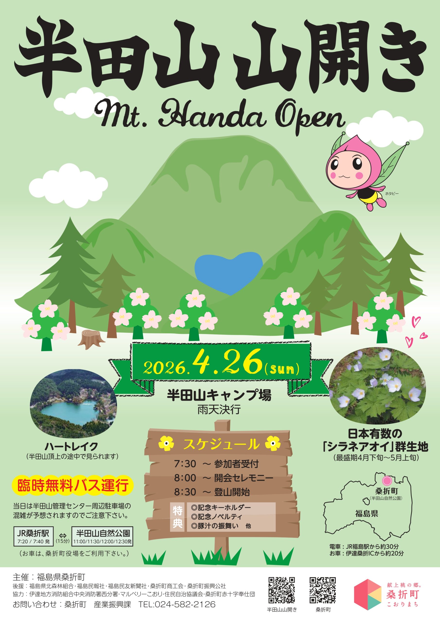 2026.04.26 半田山山開き 2026年4月1日 #イベント#桑折町#半田山#山開き#ハートレイク#登山#キャンプ 福島の「ハート」に会いに行こう。💙 令和8年度 半田山山開き 開催決定! 新緑に包まれる半田沼のブルーは、この時期だけの特別な色。 カメラ片手に、標高867mの絶景散歩はいかが? 見つけたら幸せになれる(!?)ハートの湖をぜひその目で。 開催期間 2026年4月26日(日) 会場 半田山自然公園 公式サイト >> 公式サイトはコチラ