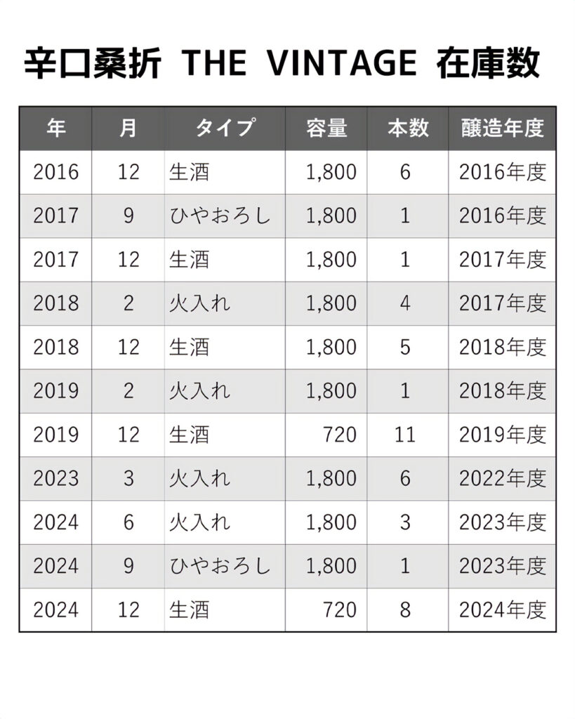 次回販売する辛口桑折の新酒が2026年3月下旬の発売を控える今、 過去のヴィンテージと飲み比べる、またとないチャンスです。時を重ねた辛口桑折、数量限定でのご提供となります。 お早めにお求めください。